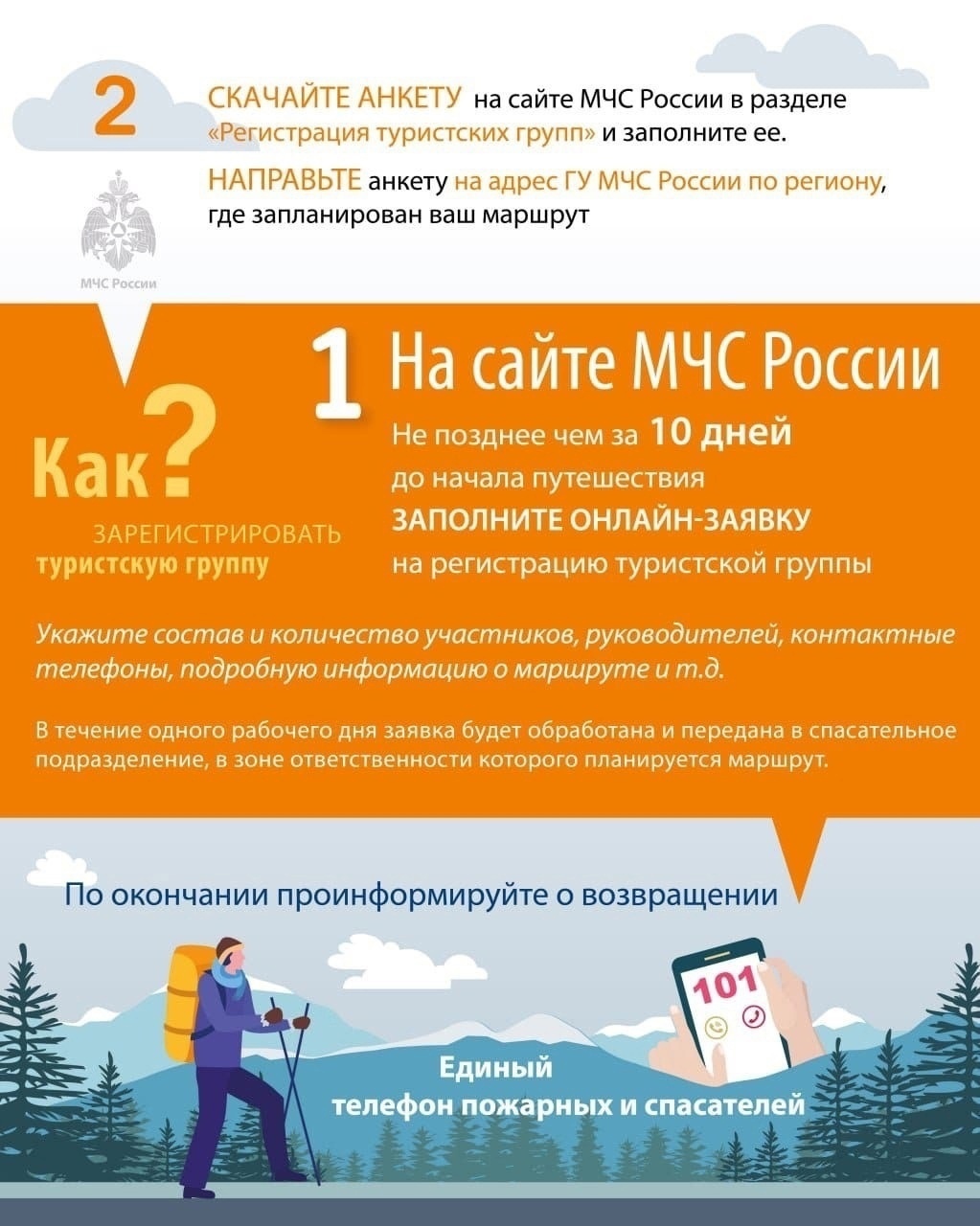 Перед путешествием каждый турист должен подумать о своей безопасности. Для того, чтобы в случае необходимости спасатели могли оперативно прийти на помощь, туристическим группам и отдельным туристам необходимо обязательно информировать подразделения МЧС о своем маршруте.