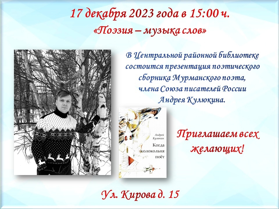 Андрей Кулюкин родился 27 февраля 1987 года. Живет в городе Заполярный Мурманской области. Участник IV и V всероссийских совещаний молодых литераторов в Химках, лауреат литературной премии политической партии «Справедливая Россия», областной литературной премии «Мурманский берег», всероссийского литературного фестиваля «Осиянное слово», литературного фестиваля «Капитан Грэй» (г. Мурманск).